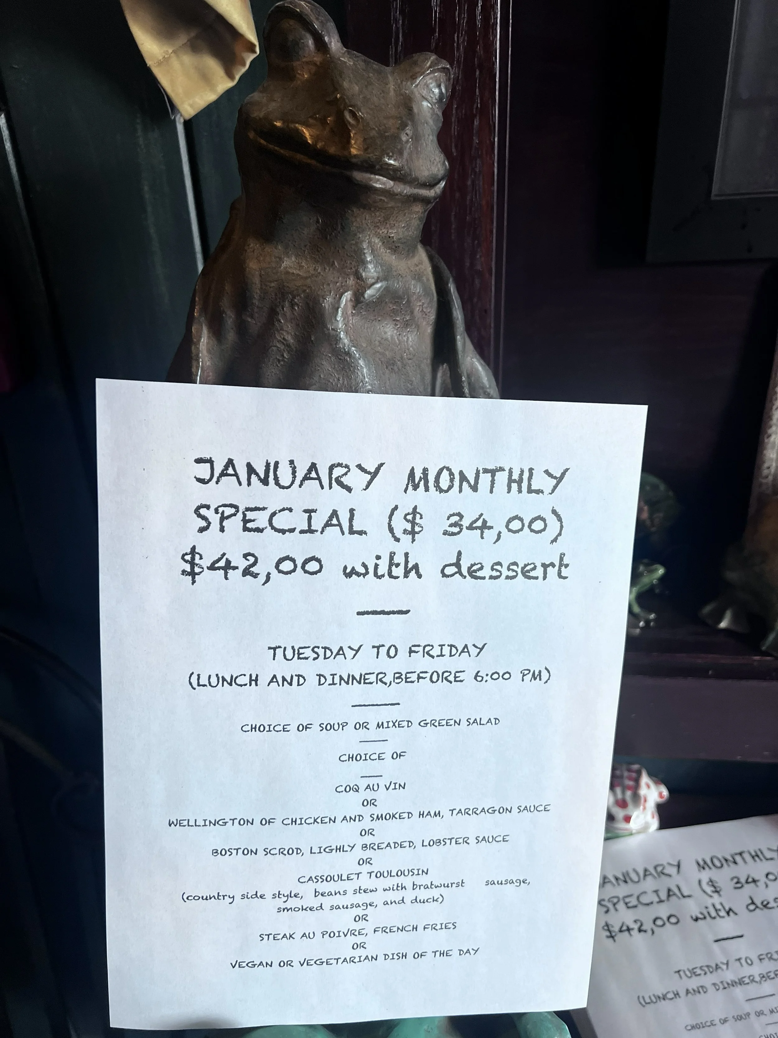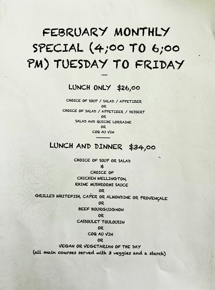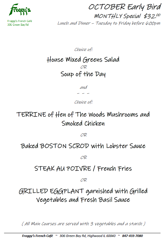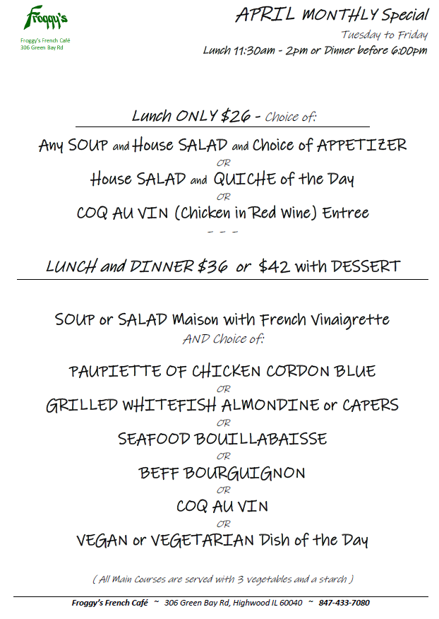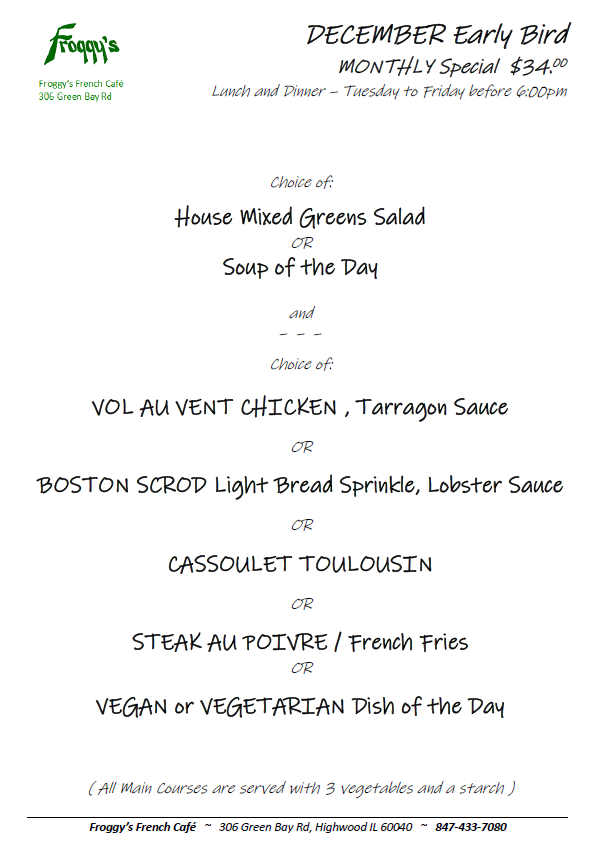 Join us Tuesday through Friday for Lunch or Dinner with your order into the kitchen before 6:00pm for the best value in town. Each month we feature several entrees of choice which come with our house potato or starch, fresh vegetables and a soup or salad before hand. No online reservations, please call for RESERVATION at 847 433 7080